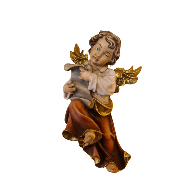 Anjo pendente em madeira segurando uma partitura, com acabamento artístico em tons de vermelho e dourado.
