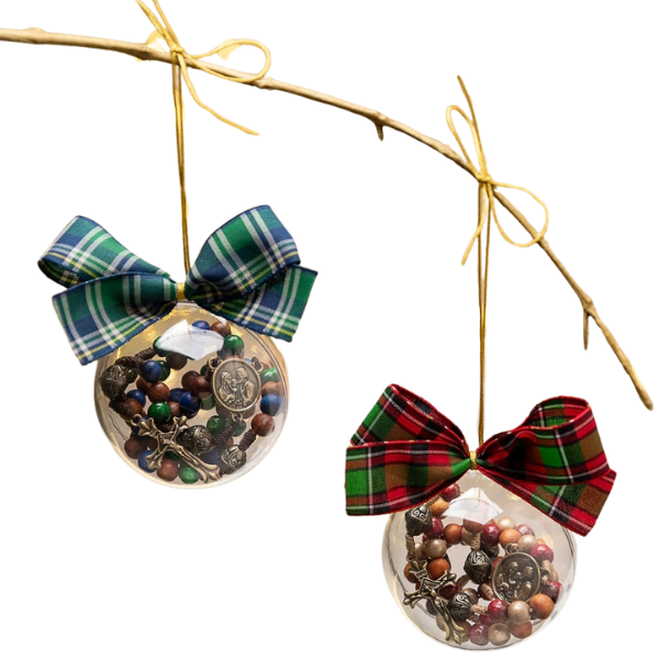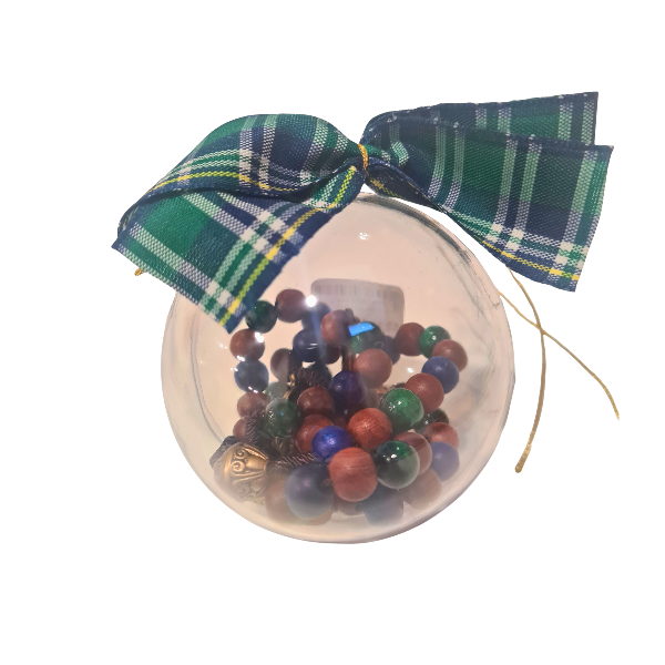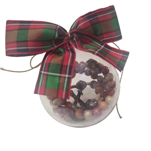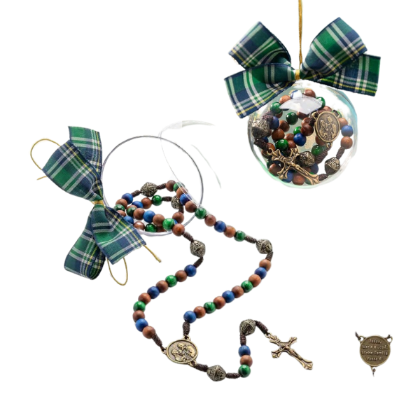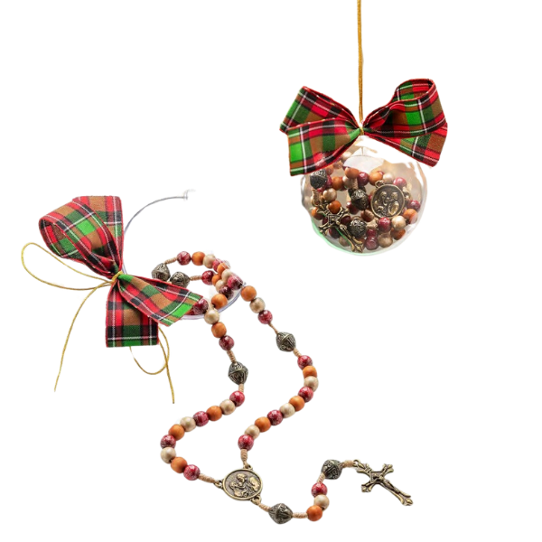 Descubra o nosso Terço Natalino exclusivo com contas em madeira 8 mm, metal em ouro velho e esfera em acrílico. Disponível em cores quentes e frias.