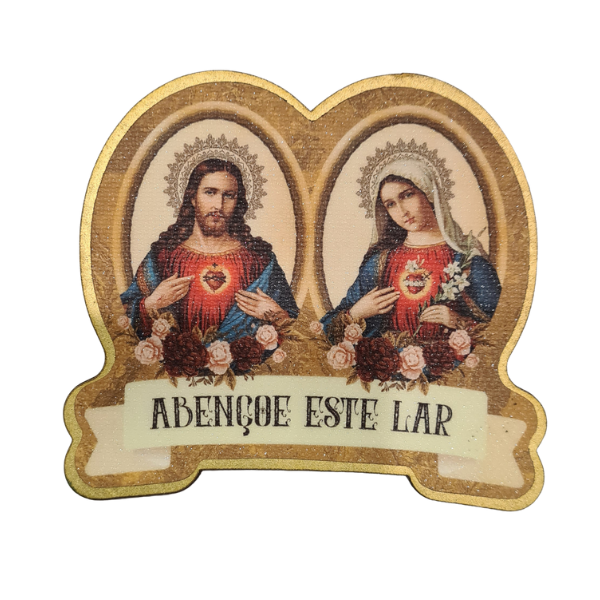 Medalhão de porta em MDF com a imagem do Sagrado Coração de Jesus e Maria e a inscrição “Abençoe Este Lar”.