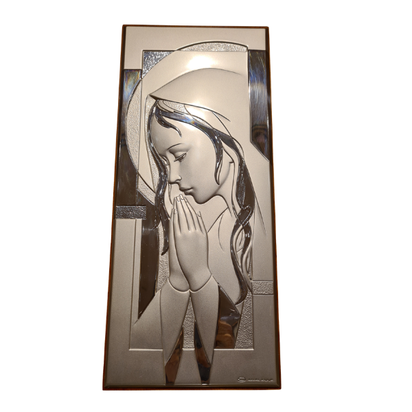 Quadro religioso em prata de lei 835‰ representando Nossa Senhora em oração, produzido pela marca italiana Menegazzi & Renzo.