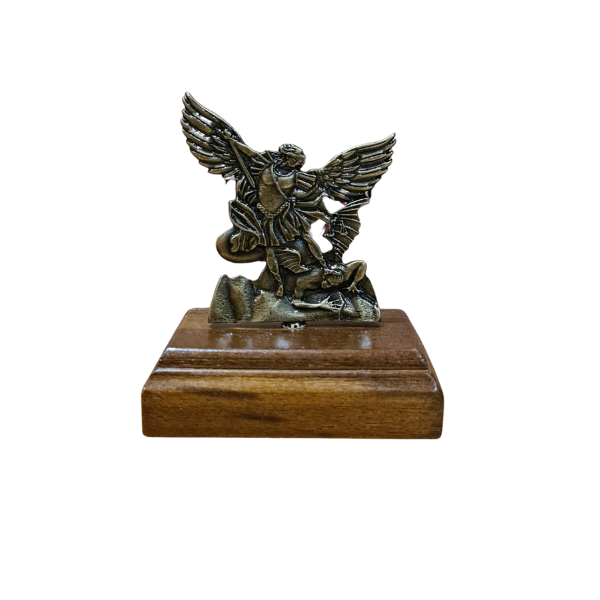 Imagem de São Miguel Arcanjo com base em madeira, peça exclusiva do Museu, símbolo de proteção e fé.