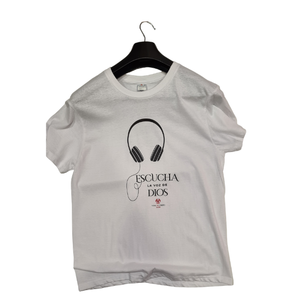 T-shirt com a mensagem “Escucha la voz de Dios”, inspirando a escutar a voz de Deus no dia a dia.