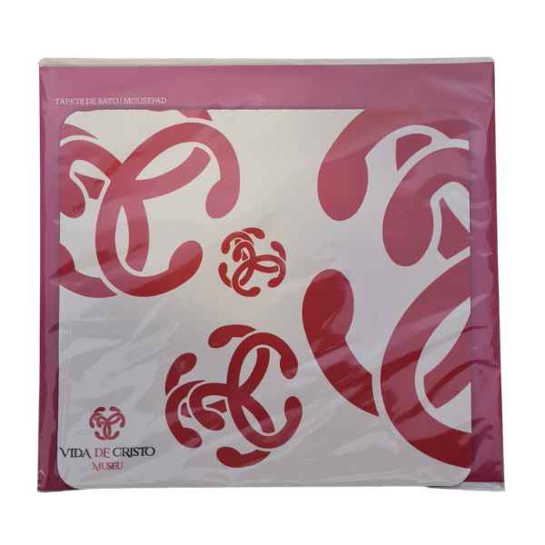 Tapete de rato (mousepad) com design do Museu Vida de Cristo, ideal para escritório ou estudo.